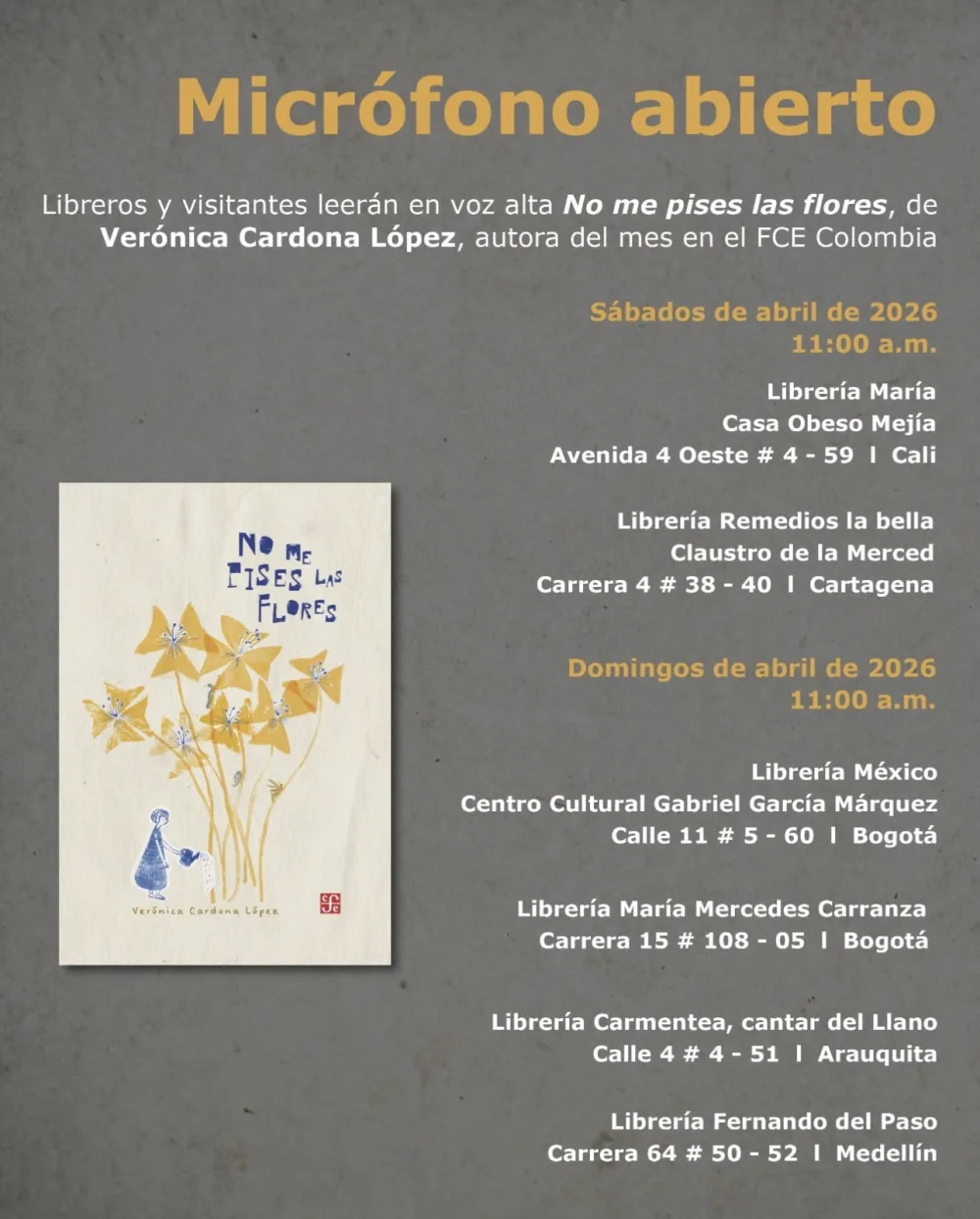 Libreros y visitantes leerán en voz alta No me pises las flores, de Verónica Cardona López, autora del mes en el FCE Colombia